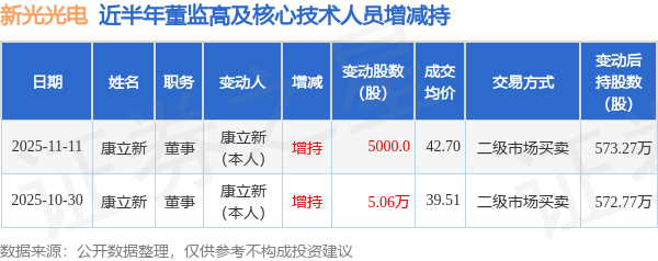 证券之星消息,根据11月11日市场公开信息、上市公司公告及交易所披露数据整理,新光光电(688011)最新董监高及相关人员股份变动情况:2025年11月11日公司董事康立新共增持公司股份5000.0股,占公司总股本为0.005%。变动期间公司股价上涨1.18%,11月11日当日收盘报42.7元。