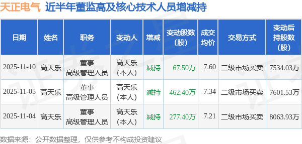 天正电气近半年内的董监高及核心技术人员增减持详情如下: