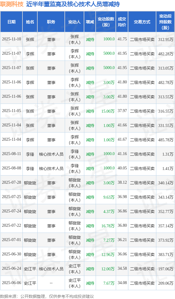 联测科技近半年内的董监高及核心技术人员增减持详情如下: