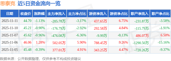证券之星消息,截至2025年11月11日收盘,思泰克(301568)报收于44.7元,下跌1.13%,换手率3.03%,成交量1.44万手,成交额6484.13万元。