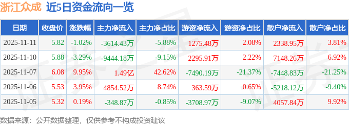 证券之星消息,截至2025年11月11日收盘,浙江众成(002522)报收于5.82元,下跌1.02%,换手率11.55%,成交量104.51万手,成交额6.14亿元。