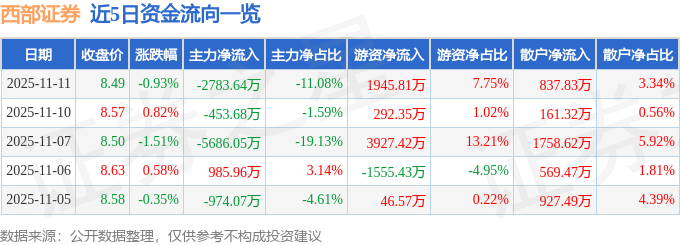 证券之星消息,截至2025年11月11日收盘,西部证券(002673)报收于8.49元,下跌0.93%,换手率0.72%,成交量29.51万手,成交额2.51亿元。