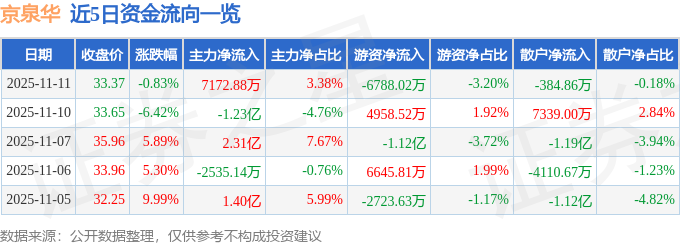 证券之星消息,截至2025年11月11日收盘,京泉华(002885)报收于33.37元,下跌0.83%,换手率27.16%,成交量62.7万手,成交额21.21亿元。