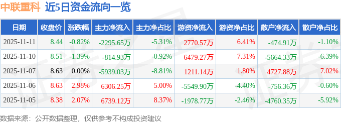 证券之星消息,截至2025年11月11日收盘,中联重科(000157)报收于8.44元,下跌0.82%,换手率0.72%,成交量51.03万手,成交额4.32亿元。