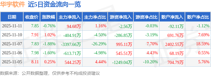 证券之星消息,截至2025年11月11日收盘,华宇软件(300271)报收于7.85元,下跌0.76%,换手率1.31%,成交量10.42万手,成交额8190.68万元。