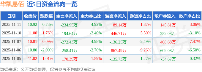 证券之星消息,截至2025年11月11日收盘,华凯易佰(300592)报收于10.92元,下跌0.73%,换手率1.24%,成交量4.36万手,成交额4771.71万元。