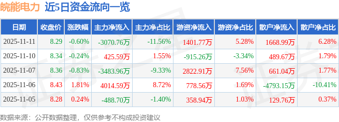 证券之星消息,截至2025年11月11日收盘,皖能电力(000543)报收于8.29元,下跌0.6%,换手率1.41%,成交量31.98万手,成交额2.66亿元。