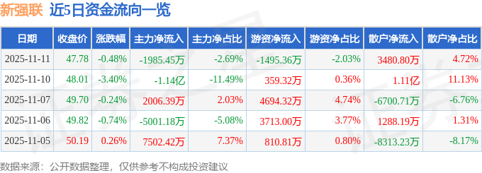 证券之星消息,截至2025年11月11日收盘,新强联(300850)报收于47.78元,下跌0.48%,换手率5.08%,成交量15.27万手,成交额7.38亿元。