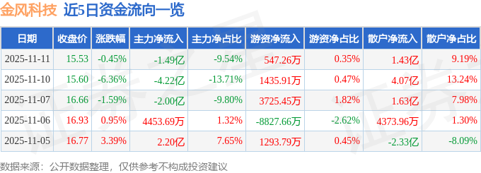 11月11日的资金流向数据方面,主力资金净流出1.49亿元,占总成交额9.54%,游资资金净流入547.26万元,占总成交额0.35%,散户资金净流入1.43亿元,占总成交额9.19%。