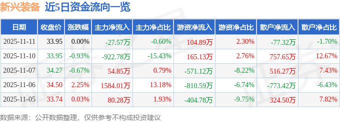 证券之星消息,截至2025年11月11日收盘,新兴装备(002933)报收于33.95元,上涨0.0%,换手率1.18%,成交量1.34万手,成交额4559.13万元。