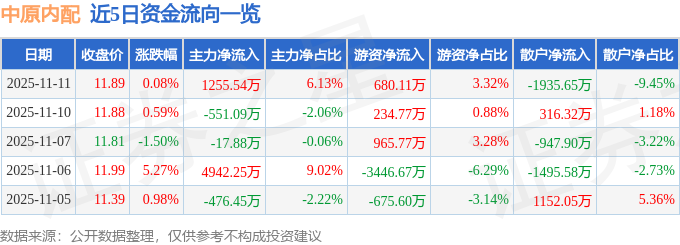 11月11日的资金流向数据方面,主力资金净流入1255.54万元,占总成交额6.13%,游资资金净流入680.11万元,占总成交额3.32%,散户资金净流出1935.65万元,占总成交额9.45%。