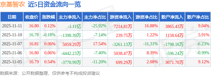 11月11日的资金流向数据方面,主力资金净流出1.11亿元,占总成交额25.92%,游资资金净流入7214.81万元,占总成交额16.88%,散户资金净流入3865.43万元,占总成交额9.04%。