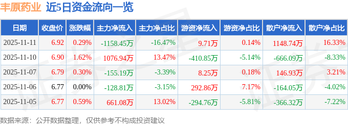 证券之星消息,截至2025年11月11日收盘,丰原药业(000153)报收于6.92元,上涨0.29%,换手率2.21%,成交量10.18万手,成交额7035.14万元。