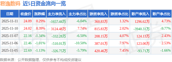 证券之星消息,截至2025年11月11日收盘,君逸数码(301172)报收于24.09元,上涨0.29%,换手率11.52%,成交量11.37万手,成交额2.74亿元。