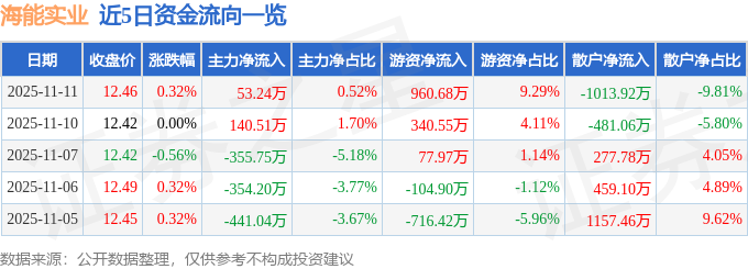 证券之星消息,截至2025年11月11日收盘,海能实业(300787)报收于12.46元,上涨0.32%,换手率4.34%,成交量8.29万手,成交额1.03亿元。