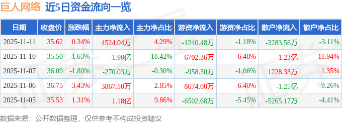 证券之星消息,截至2025年11月11日收盘,巨人网络(002558)报收于35.62元,上涨0.34%,换手率1.51%,成交量29.17万手,成交额10.54亿元。