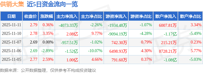 证券之星消息,截至2025年11月11日收盘,供销大集(000564)报收于2.79元,上涨0.36%,换手率4.37%,成交量643.11万手,成交额18.01亿元。