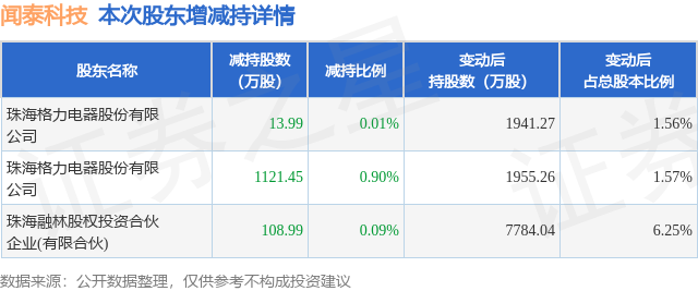 证券之星消息,11月11日闻泰科技发布公告《闻泰科技:关于持股5%以上股东权益变动触及1%刻度暨减持股份结果公告》,其股东珠海格力电器股份有限公司、珠海融林股权投资合伙企业(有限合伙)于2025年8月22日至2025年11月11日间合计减持1244.43万股,占公司目前总股本的0.9998%,变动期间该股股价上涨17.24%,截止11月11日收盘报46.25元。