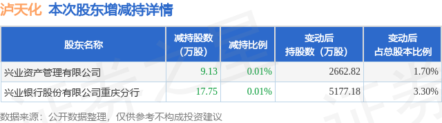 证券之星消息,11月11日泸天化发布公告《泸天化:简式权益变动报告书》,其股东兴业资产管理有限公司、兴业银行股份有限公司重庆分行于2025年8月22日至2025年11月11日间合计减持26.88万股,占公司目前总股本的0.0171%,变动期间该股股价上涨5.46%,截止11月11日收盘报4.83元。