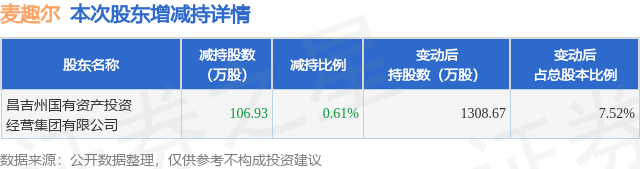 证券之星消息,11月11日麦趣尔发布公告《麦趣尔:关于5%以上股东减持股份触及1%刻度的公告》,其股东昌吉州国有资产投资经营集团有限公司于2025年11月6日至2025年11月11日间合计减持106.93万股,占公司目前总股本的0.614%,变动期间该股股价上涨5.58%,截止11月11日收盘报10.21元。