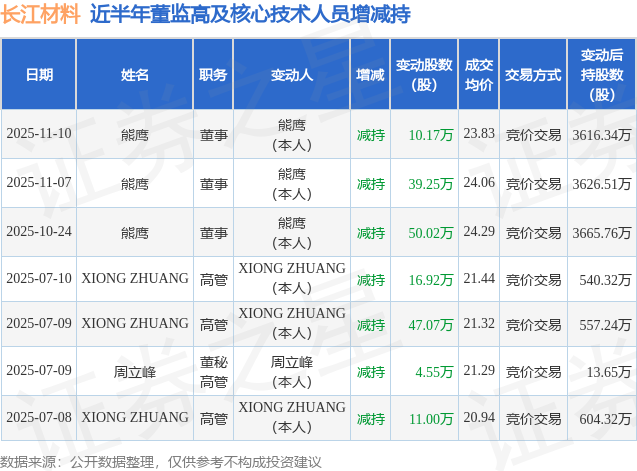 长江材料近半年内的董监高及核心技术人员增减持详情如下: