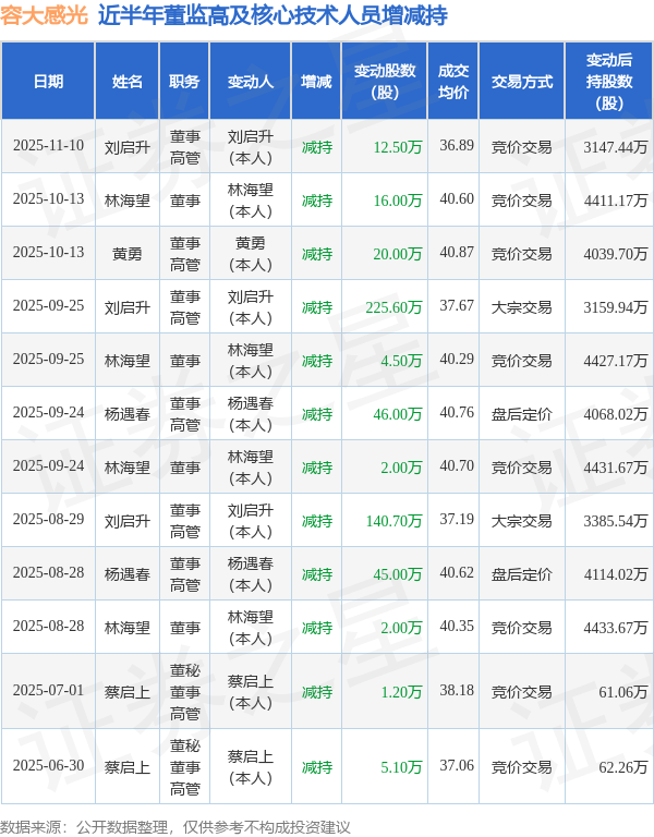 容大感光近半年内的董监高及核心技术人员增减持详情如下: