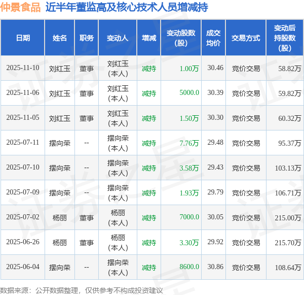 仲景食品近半年内的董监高及核心技术人员增减持详情如下:
