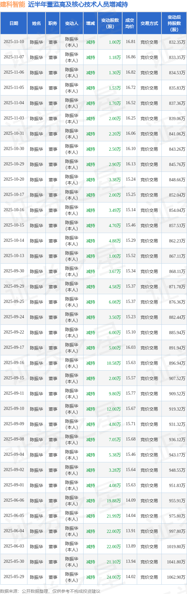 建科智能近半年内的董监高及核心技术人员增减持详情如下: