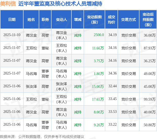 美利信近半年内的董监高及核心技术人员增减持详情如下: