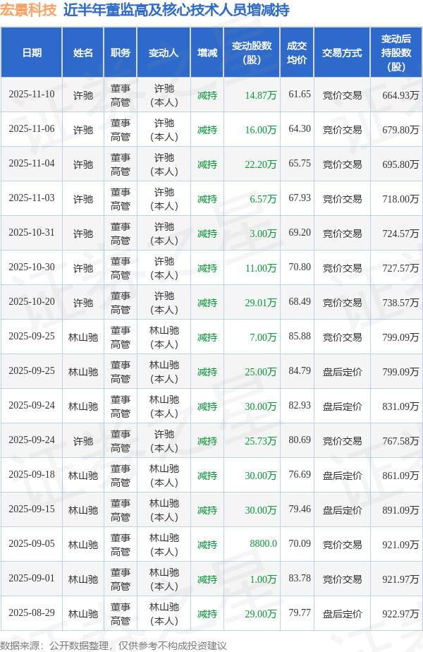 宏景科技近半年内的董监高及核心技术人员增减持详情如下: