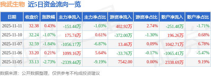 证券之星消息,截至2025年11月11日收盘,我武生物(300357)报收于32.38元,上涨0.43%,换手率0.94%,成交量4.55万手,成交额1.47亿元。