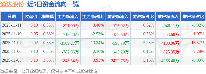 证券之星消息,截至2025年11月11日收盘,通达股份(002560)报收于9.1元,上涨0.55%,换手率5.86%,成交量26.52万手,成交额2.41亿元。