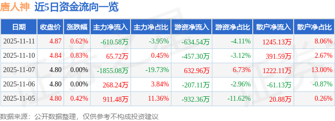 证券之星消息,截至2025年11月11日收盘,唐人神(002567)报收于4.87元,上涨0.62%,换手率2.23%,成交量31.87万手,成交额1.55亿元。