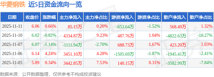 证券之星消息,截至2025年11月11日收盘,华菱钢铁(000932)报收于6.06元,上涨0.66%,换手率1.03%,成交量71.33万手,成交额4.3亿元。