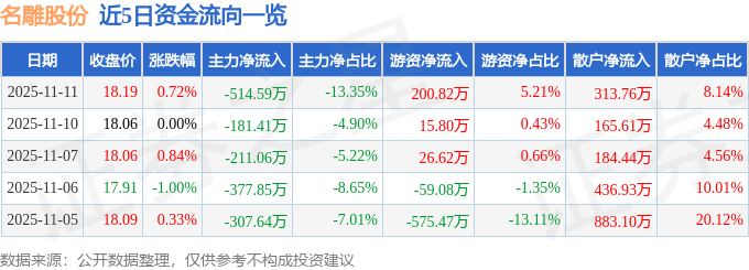 证券之星消息,截至2025年11月11日收盘,名雕股份(002830)报收于18.19元,上涨0.72%,换手率3.17%,成交量2.12万手,成交额3855.98万元。