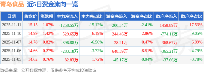 证券之星消息,截至2025年11月11日收盘,青岛食品(001219)报收于15.15元,上涨1.07%,换手率2.91%,成交量5.53万手,成交额8324.43万元。