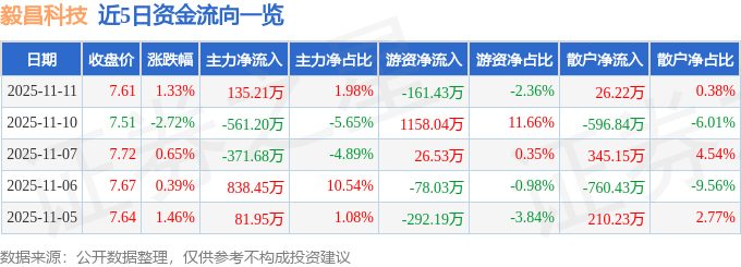 证券之星消息,截至2025年11月11日收盘,毅昌科技(002420)报收于7.61元,上涨1.33%,换手率2.27%,成交量9.06万手,成交额6843.45万元。