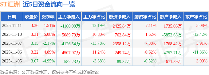 证券之星消息,截至2025年11月11日收盘,ST汇洲(002122)报收于3.36元,上涨1.51%,换手率5.16%,成交量102.65万手,成交额3.41亿元。