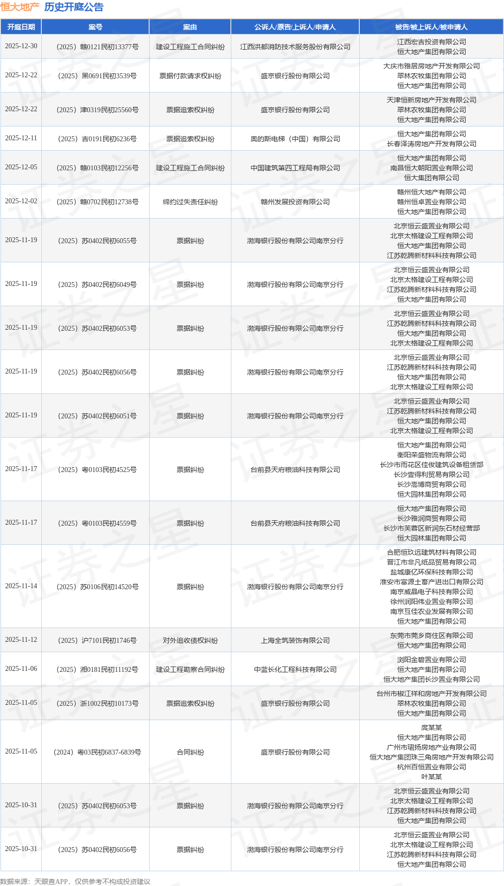 案号:(2025)苏0106民初14520号根据统计,近一年内以恒大地产集团有限公司为当事人的历史开庭公告有870则,其中案由为“票据纠纷”的公告以243则居首,其次为“合同纠纷”有162则,“建设工程施工合同纠纷”有135则。历史开庭公告(前20条)如下: