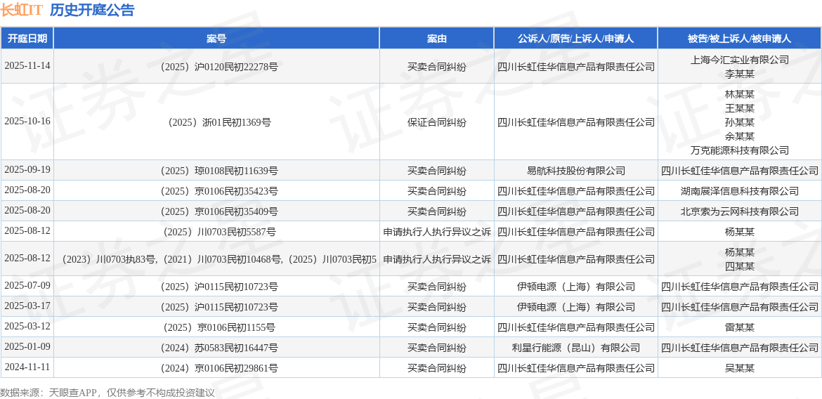 案号:(2025)沪0120民初22278号根据统计,近一年内以四川长虹佳华信息产品有限责任公司为当事人的历史开庭公告有12则,其中案由为“买卖合同纠纷”的公告以9则居首,其次为“申请执行人执行异议之诉”有2则,“保证合同纠纷”有1则。历史开庭公告如下: