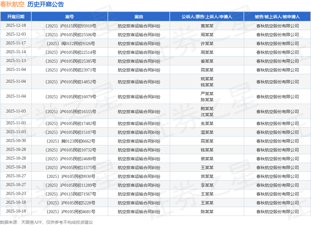 案号:(2025)沪0105民初22514号根据统计,近一年内以春秋航空股份有限公司为当事人的历史开庭公告有105则,其中案由为“航空旅客运输合同纠纷”的公告以66则居首,其次为“网络服务合同纠纷”有13则,“劳动合同纠纷”有12则。历史开庭公告(前20条)如下: