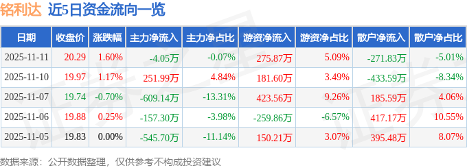 证券之星消息,截至2025年11月11日收盘,铭利达(301268)报收于20.29元,上涨1.6%,换手率0.77%,成交量2.68万手,成交额5424.75万元。