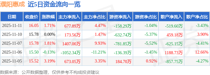 证券之星消息,截至2025年11月11日收盘,濮阳惠成(300481)报收于16.05元,上涨1.71%,换手率3.27%,成交量9.48万手,成交额1.52亿元。