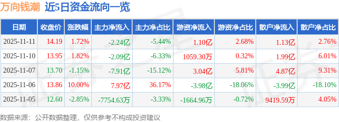 11月11日的资金流向数据方面,主力资金净流出2.24亿元,占总成交额5.44%,游资资金净流入1.1亿元,占总成交额2.68%,散户资金净流入1.13亿元,占总成交额2.76%。