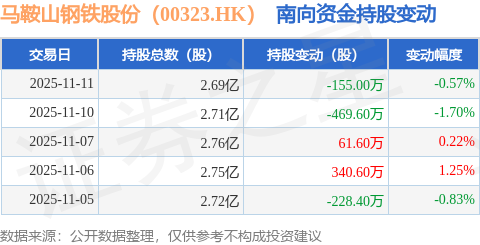 证券之星消息,11月11日南向资金减持155.0万股马鞍山钢铁股份(00323.HK)。近5个交易日中,获南向资金减持的有3天,累计净减持450.8万股。近20个交易日中,获南向资金增持的有12天,累计净增持209.6万股。截至目前,南向资金持有马鞍山钢铁股份(00323.HK)2.69亿股,占公司已发行普通股的15.54%。