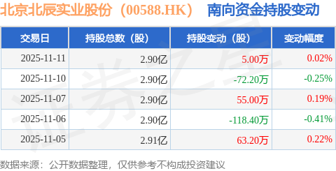 证券之星消息,11月11日南向资金增持5.0万股北京北辰实业股份(00588.HK)。近5个交易日中,获南向资金减持的有2天,累计净减持67.4万股。近20个交易日中,获南向资金增持的有10天,累计净增持1180.4万股。截至目前,南向资金持有北京北辰实业股份(00588.HK)2.9亿股,占公司已发行普通股的40.96%。