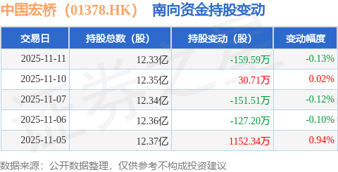 证券之星消息,11月11日南向资金减持159.59万股中国宏桥(01378.HK)。近5个交易日中,获南向资金增持的有2天,累计净增持744.75万股。近20个交易日中,获南向资金减持的有14天,累计净减持2707.84万股。截至目前,南向资金持有中国宏桥(01378.HK)12.33亿股,占公司已发行普通股的12.93%。
