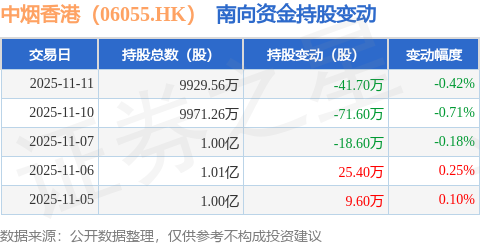 证券之星消息,11月11日南向资金减持41.7万股中烟香港(06055.HK)。近5个交易日中,获南向资金减持的有3天,累计净减持96.9万股。近20个交易日中,获南向资金减持的有11天,累计净减持203.7万股。截至目前,南向资金持有中烟香港(06055.HK)9929.56万股,占公司已发行普通股的14.35%。