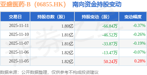 证券之星消息,11月11日南向资金减持66.84万股亚盛医药-B(06855.HK)。近5个交易日中,获南向资金减持的有4天,累计净减持110.46万股。近20个交易日中,获南向资金减持的有16天,累计净减持472.23万股。截至目前,南向资金持有亚盛医药-B(06855.HK)1.8亿股,占公司已发行普通股的48.22%。