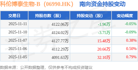 证券之星消息,11月11日南向资金减持1.96万股科伦博泰生物-B(06990.HK)。近5个交易日中,获南向资金增持的有3天,累计净增持62.53万股。近20个交易日中,获南向资金减持的有12天,累计净减持49.56万股。截至目前,南向资金持有科伦博泰生物-B(06990.HK)4122.06万股,占公司已发行普通股的25.31%。
